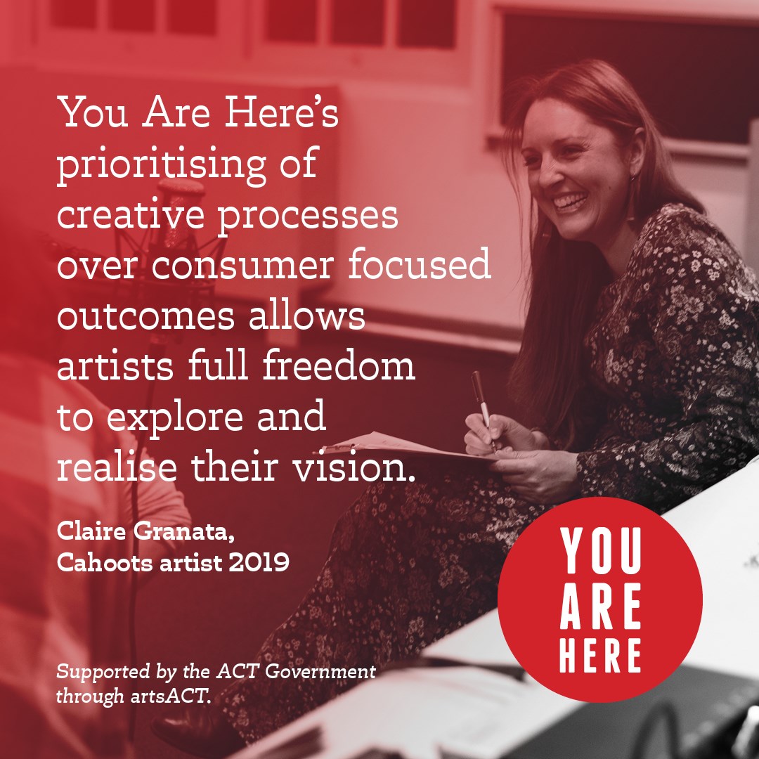 This year we gave the residency program a name, Cahoots (I was aggressive that the name should be dorky and warm), to help Canberrans clock that we have a new format and easily to distinguish between the residency program and the event season. The latter point ended up being less critical than we thought, as our truly delightful gang of artists (including a filmmaker, a textiles artist, a poet, a clown, and the usual mess of hard-to-categorise interdisciplinary folk) were mostly in need of license and support to iterate and test work without the pressure of presenting something ‘finished’.