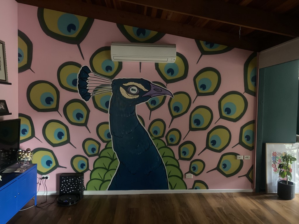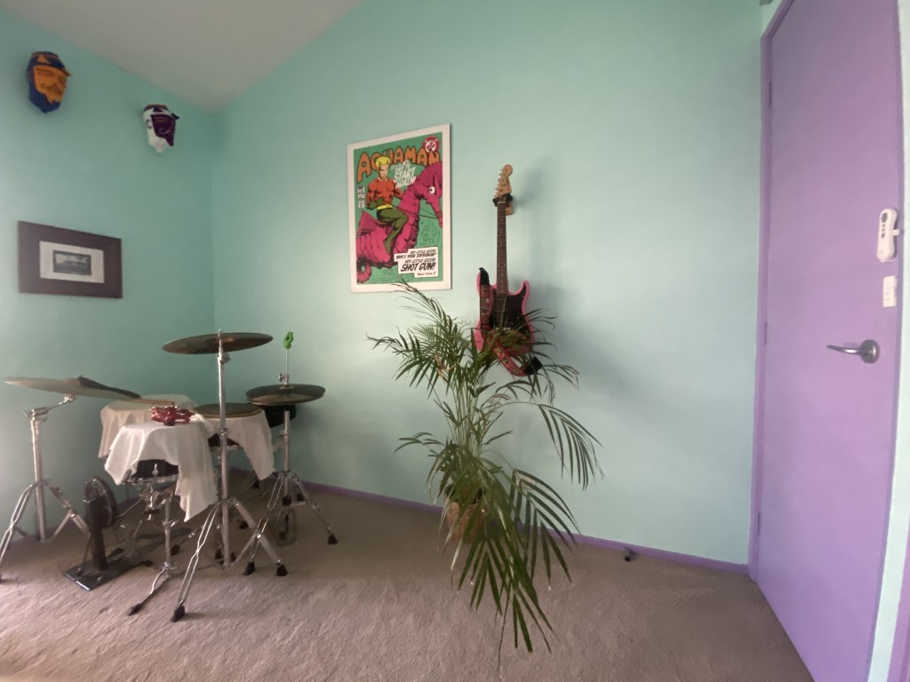 Lou and I always wanted to re-paint the walls of the house – the all beige colour scheme was… fine, but we wanted something that spoke to our vibrant and camp tastes. The crown jewel is the amazing peacock mural we commissioned from Houl, but once we’d painted parts of the rest of the house, I started to resent the still-brown walls of the music room. I play drums every day and while I hadn’t considered them much before, now staring at those walls began to actively tick me off.