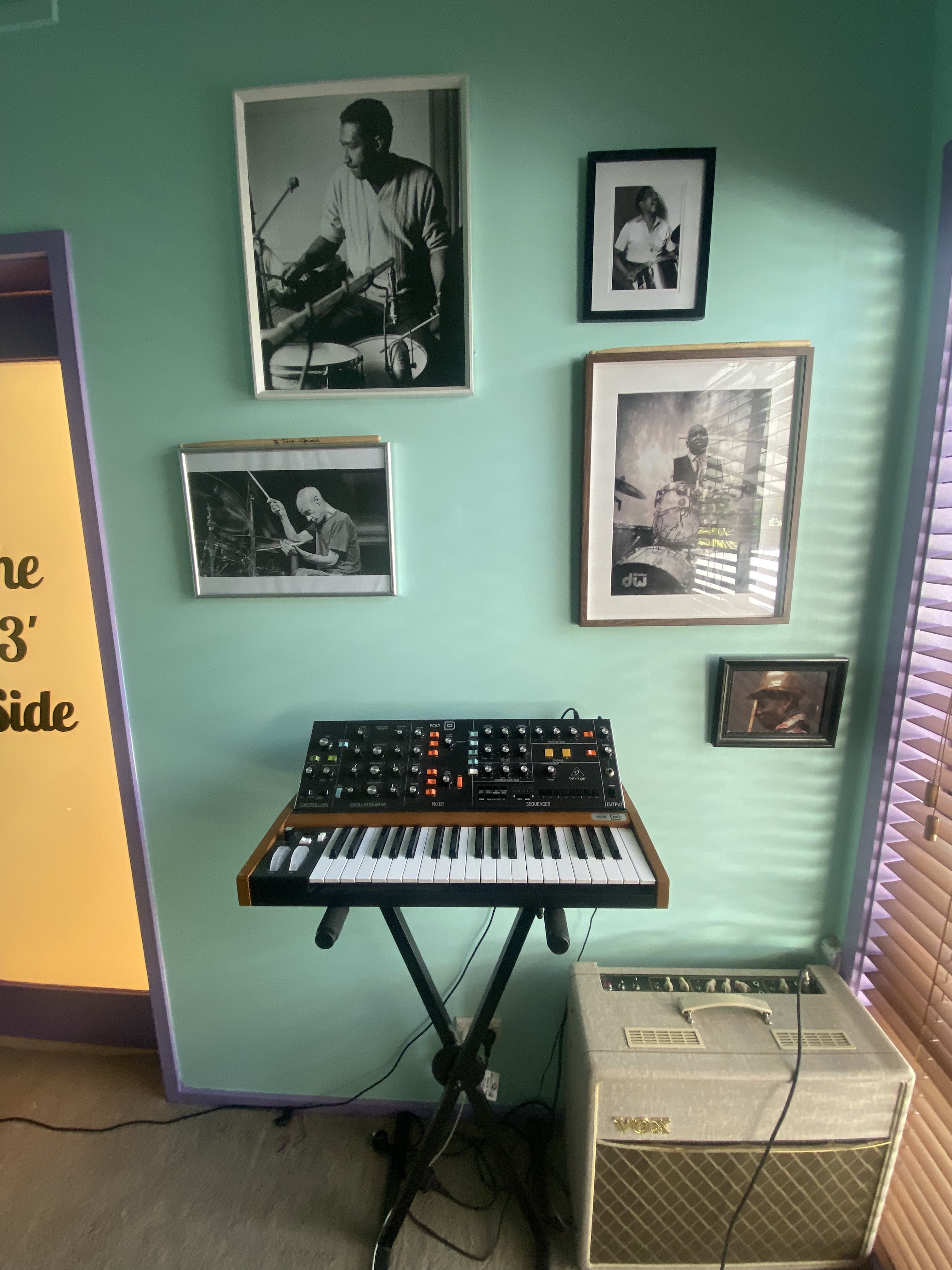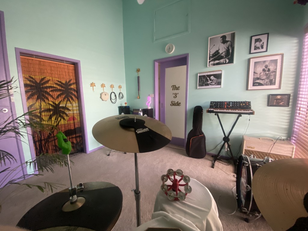 While sitting and playing the drums, I began to daydream about what the space could become. First step was excising that drab brown. The colours are inspired by the many bold palettes we encountered during our travels this year through New Orleans and Miami. Specifically, I loved the inside of Sweat Records, and sought to match their combination of minty walls with purple accents.