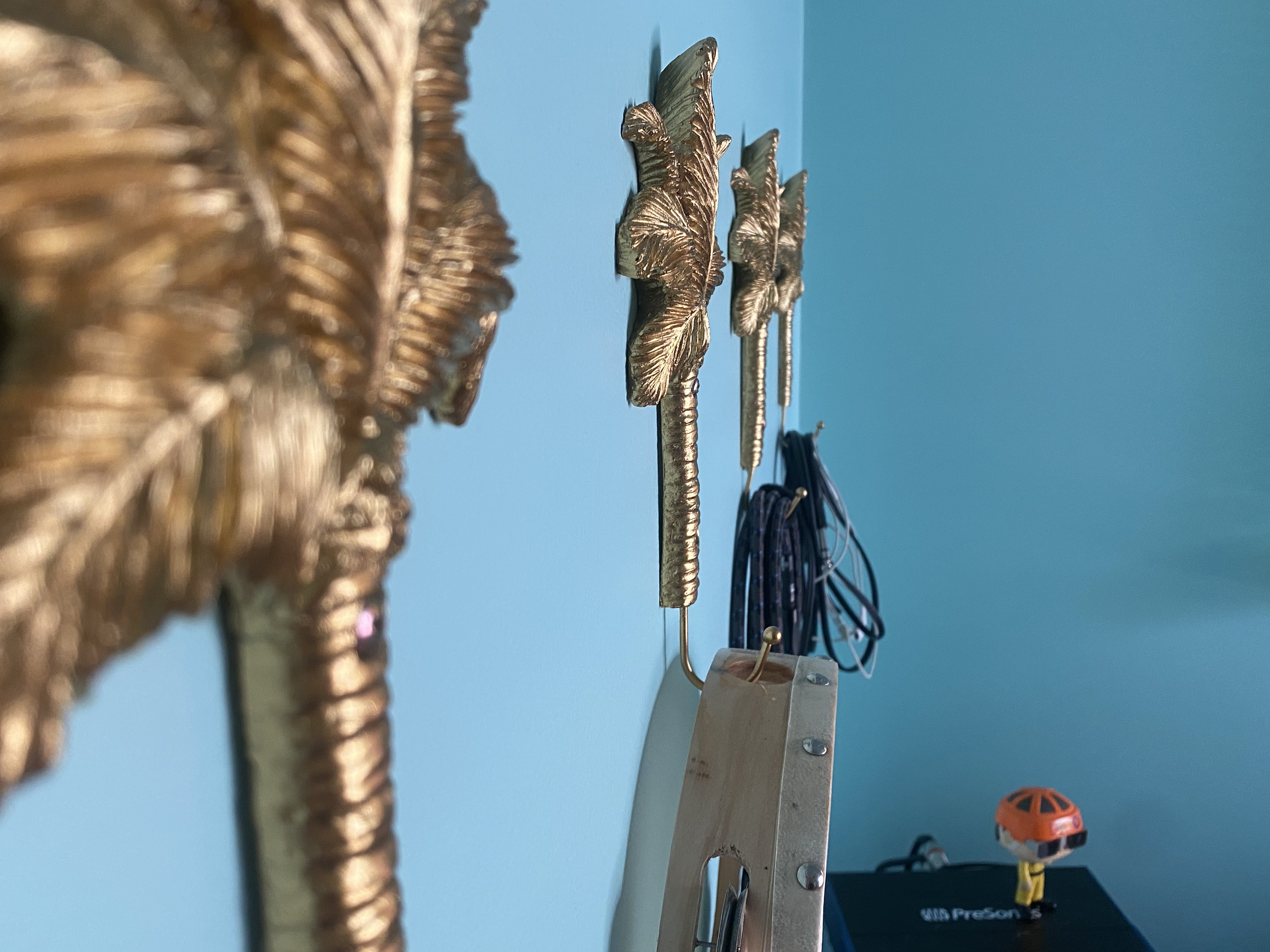 The gold palm tree hooks were kismet – when I came across them at K-Mart, I knew I wanted to make a feature of them. They serve as another tropical motif, and double down on both the opulence and playfulness of the room.