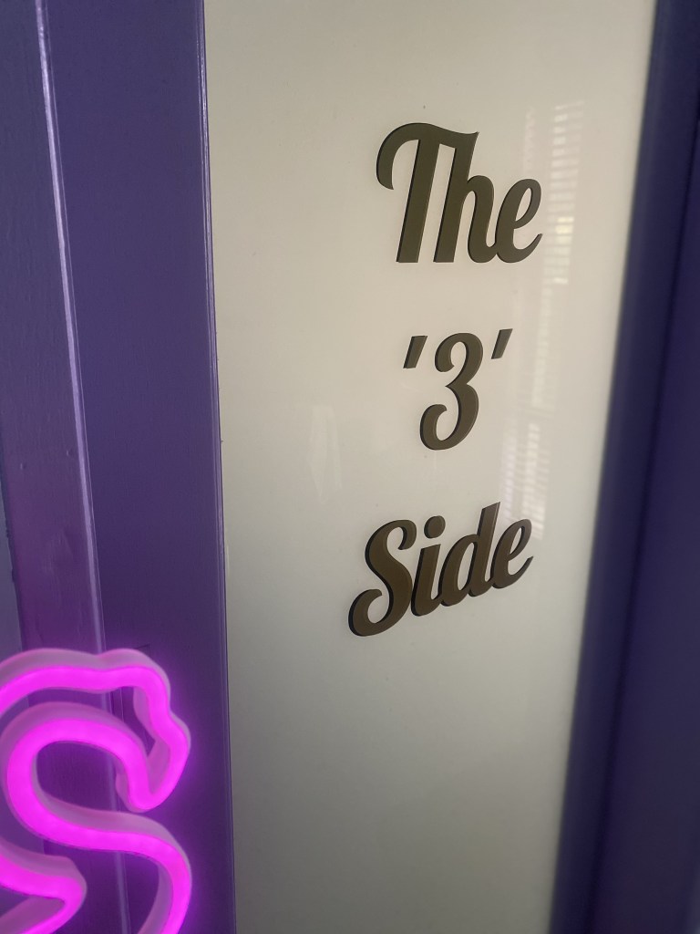 The room used to be the old master bedroom of the house, replete with an ensuite. I thought there might be something fun I could do with the frosted glass sliding door. The glass door made me think of private eyes’ offices’ from old noir films, the kind that have their name and title imprinted on them. I thought maybe I could put the name of the room on the sliding door in a similar style. An earlier music room in our old house had been called ‘The Baby Room’, a jokey reference to what the spare bedroom might eventually become. For this revitalised space, I wanted something that spoke to my drumming obsession. I went with ‘The 3 Side’. The 3 side of the clave is my favourite rhythm – well not just mine, it pops up everywhere and underpins some of the most popular styles of music across the world – and seemed like a name suitable for both a studio or a smokey speakeasy. Now it looks like the entry way to a jazz club, or another dimension!