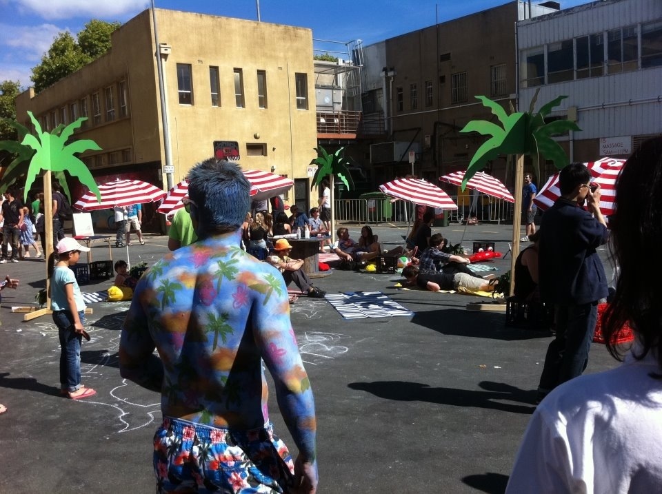 I’ve covered my bodypaint exploits in detail in a previous post, but it’s worth noting that the above job was the result of about 90 minutes of tireless effort by You Are Here visual-artist-in-residence George Edwards and our operations manager Karmin Cooper. The paint job was my cockamamie way of contributing to The Beach, a day festival in which we made over the rather scum-tacular Tocumwal Lane into a fully-blown faux beach party.